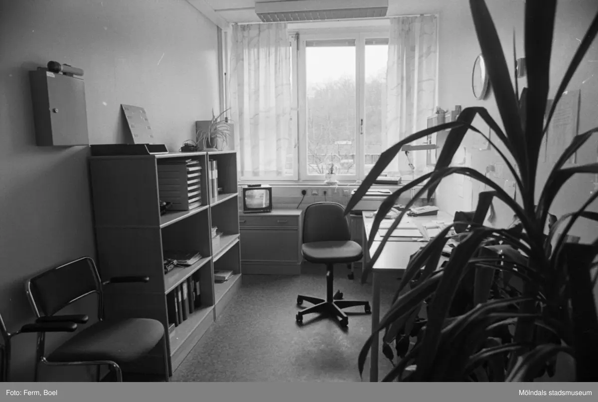 Dokumentation av Sagåsens flyktingförläggning 1992. Ett kontorsrum möblerat med skrivbord, stolar, stor yucca-palm samt förvaringsmöbel.