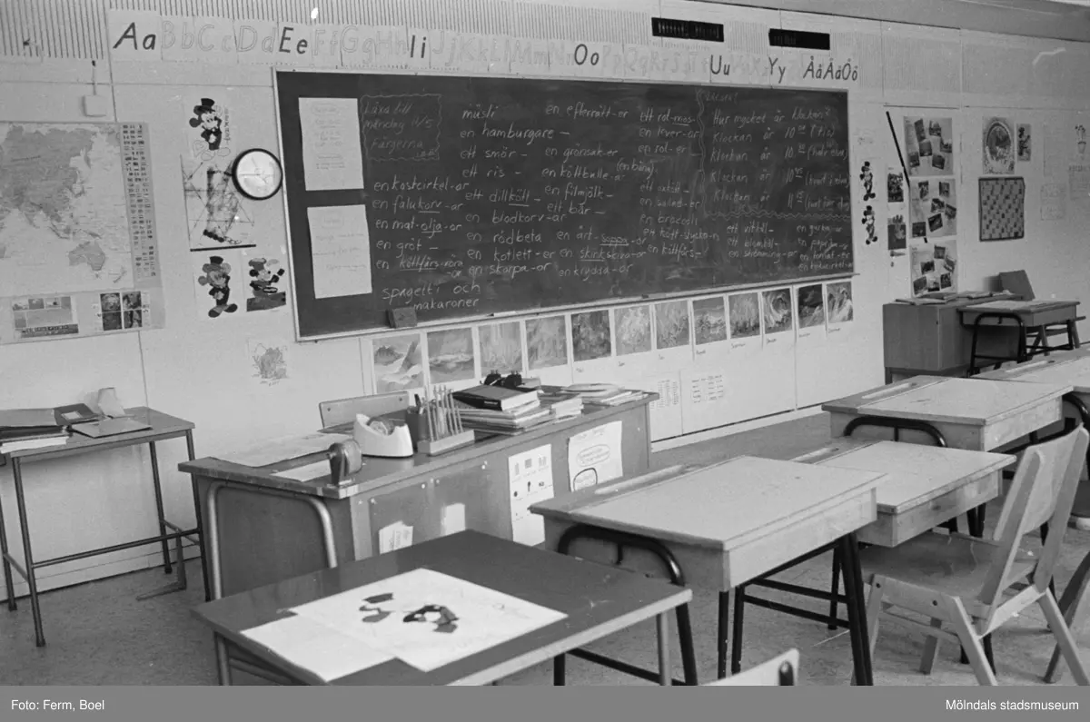 Titel: Ett klassrum med bänkar och svarta tavla. Dokumentation av Sagåsens flyktingförläggning, 1992.
