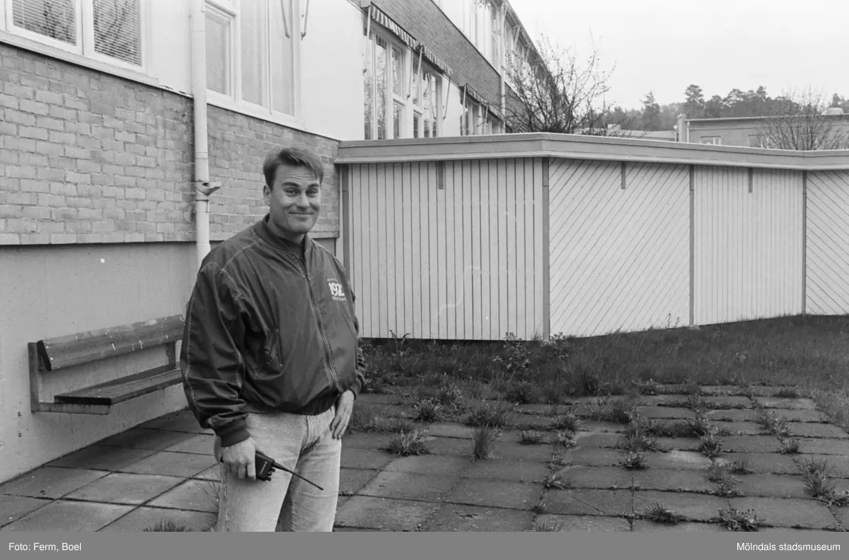 Dokumentation av Sagåsens flyktingförläggning 1992. En man står utomhus framför en byggnad. En bänk och insynsskydd finns i bakgrunden.