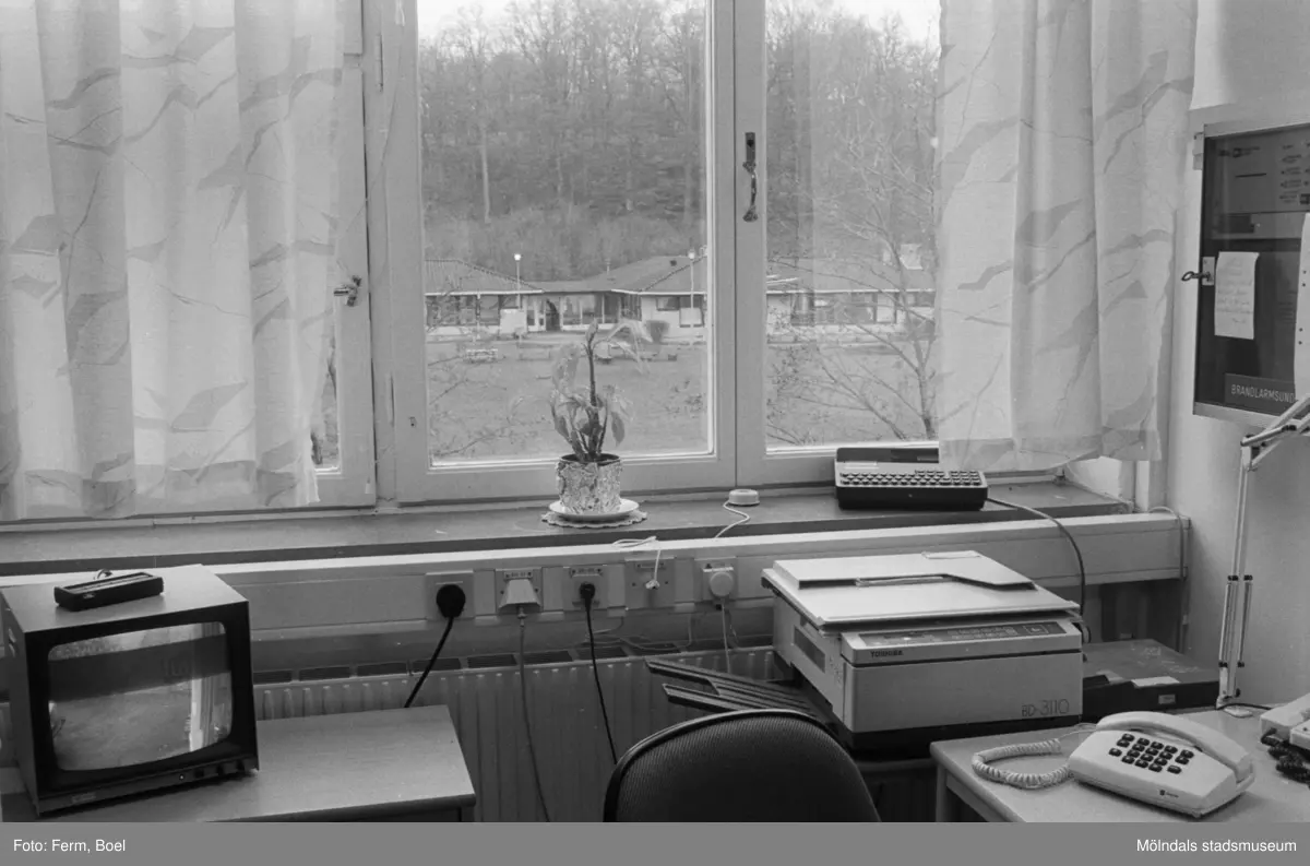 Dokumentation av Sagåsens flyktingförläggning 1992. Del av ett kontorsrum med tv, telefon, skrivare och fax. I fönstret står en krukväxt.