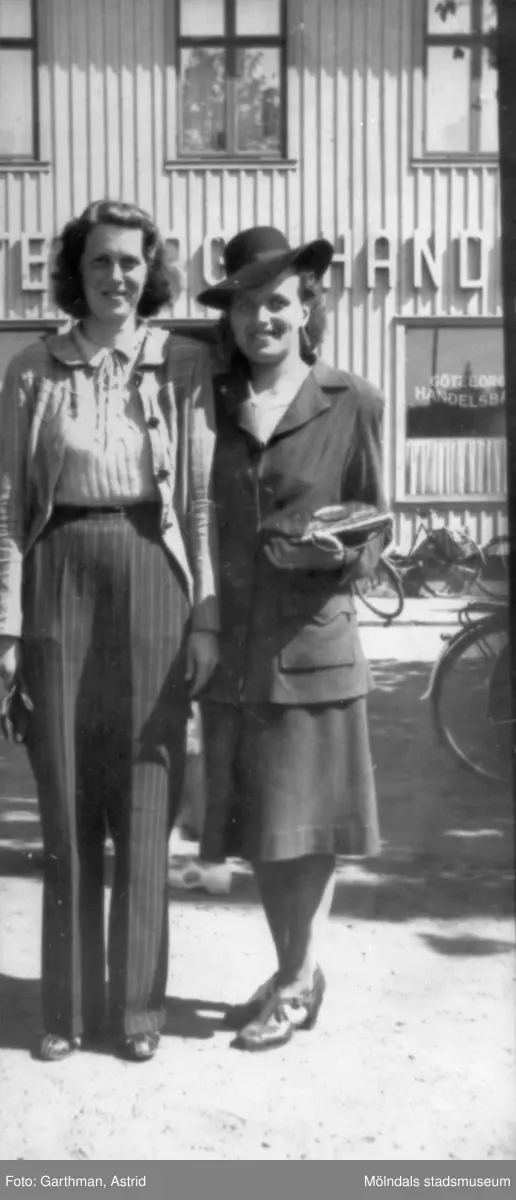 Astrid Garthmans väninna Karin Karlsson med sin vän vid Mölndalsbro Handelsbanken. 1930 till 40-tal