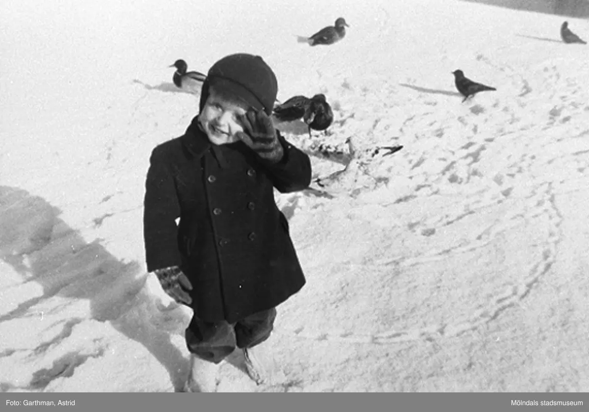 Jerry Garthman matar ankor vid Mölndalsån, vinter 1950-tal.