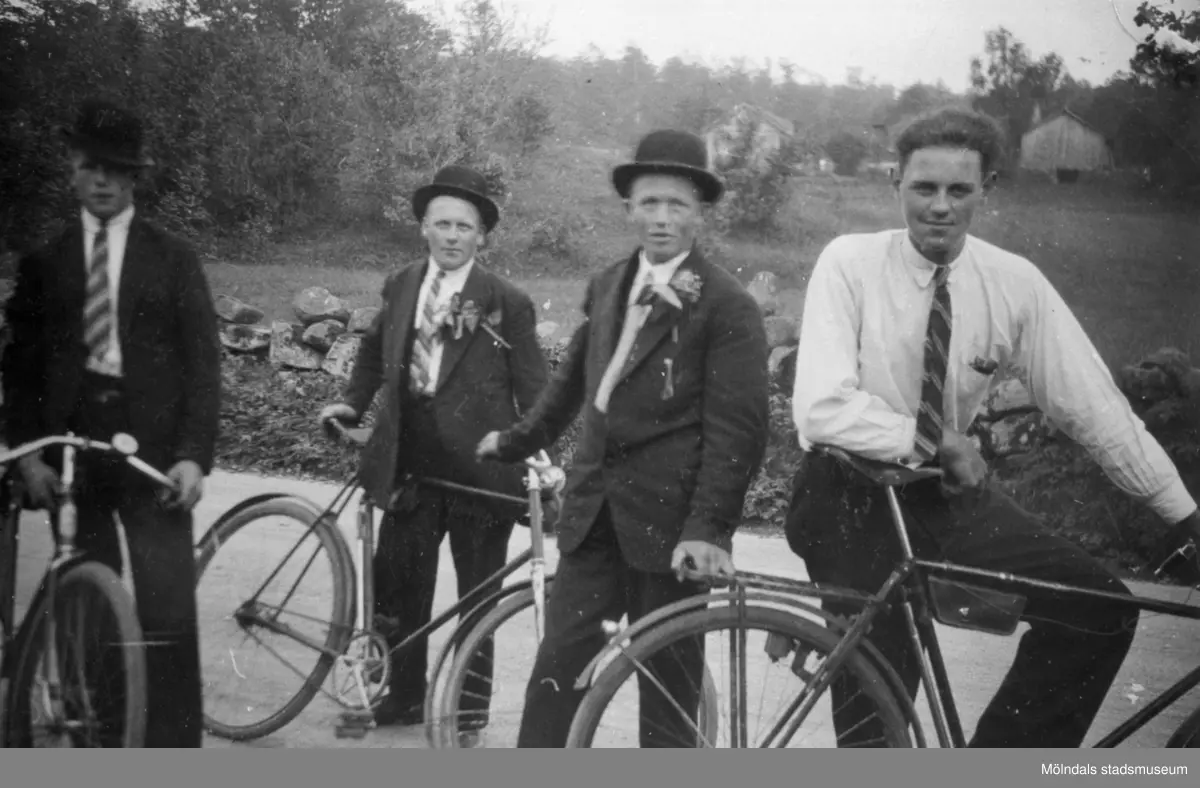 Bröderna Gustaf, Erik och Arvid Svensson med kompisen John Sundberg på cykeltur till dansbanan, 1930.