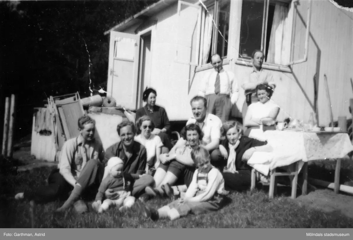 Gruppfoto från 1950-talet i Fjärås. Helmer Garthmans vänner Charlie och Elsa Jinerstedts vid deras sommarstuga.