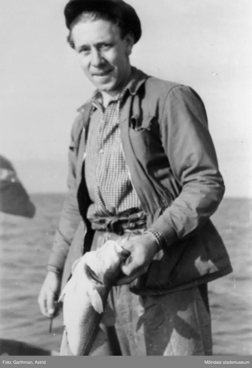 Rolf Andersson, API-arbetskamrat till Helmer Garthman, har fått en torsk. Näset, 1950-tal.