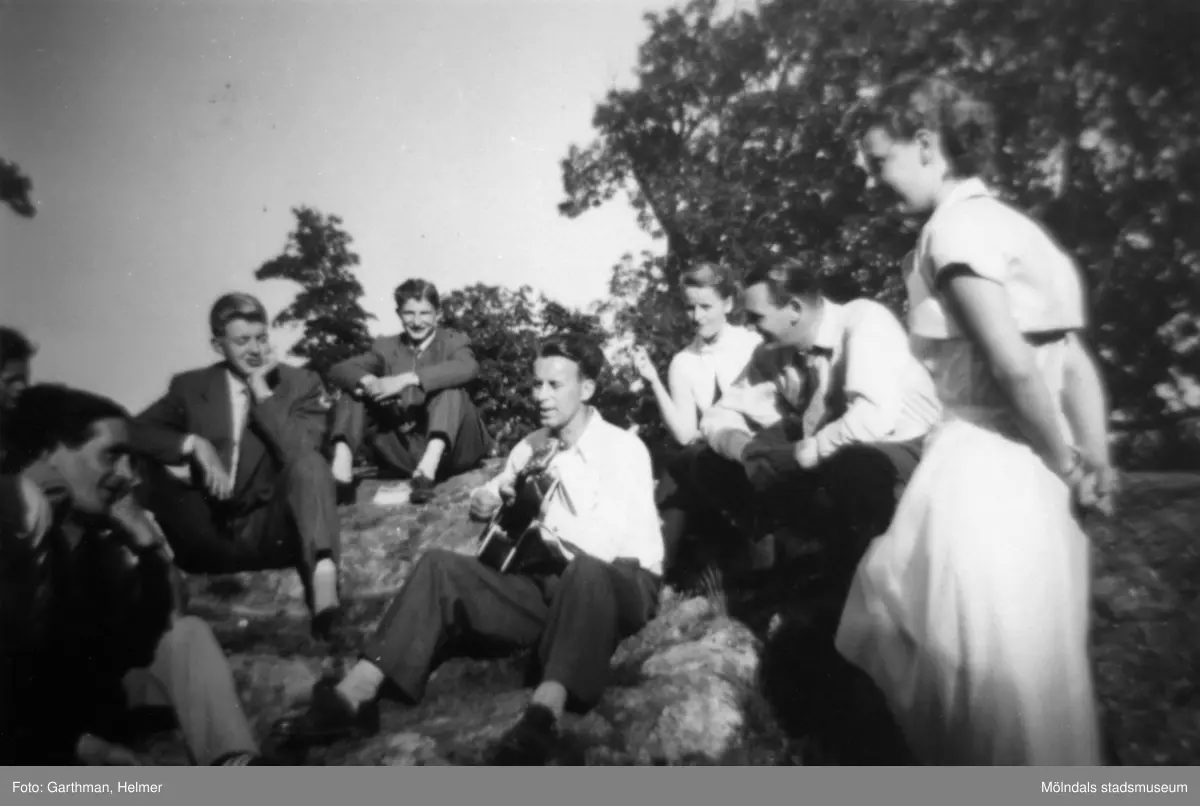 Flertalet arbetskamrater från AB Pumpindustri (API) sitter/står på en bergskulle och lyssnar till en man som spelar gitarr i mitten. Helmer Garthman och jobbarkompisar är på utflykt under 1950-talet.