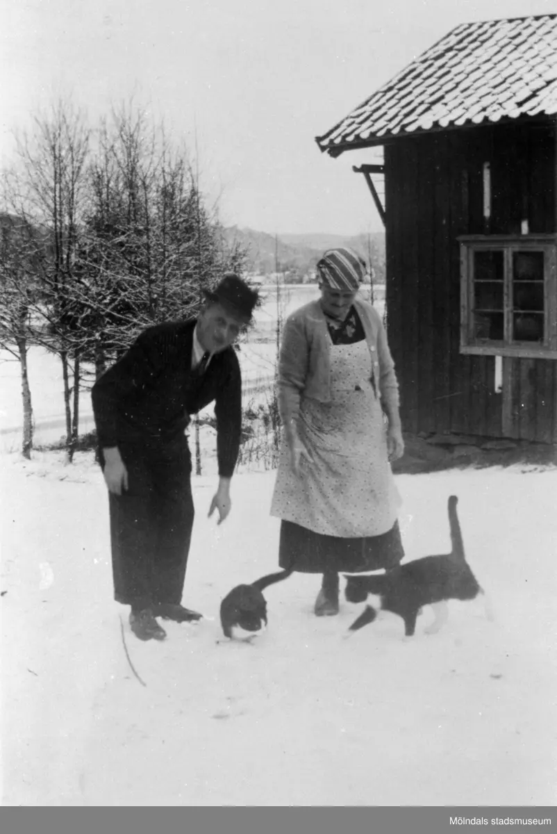 Arvid och hans mamma Klara samt katter, 1940-talet.