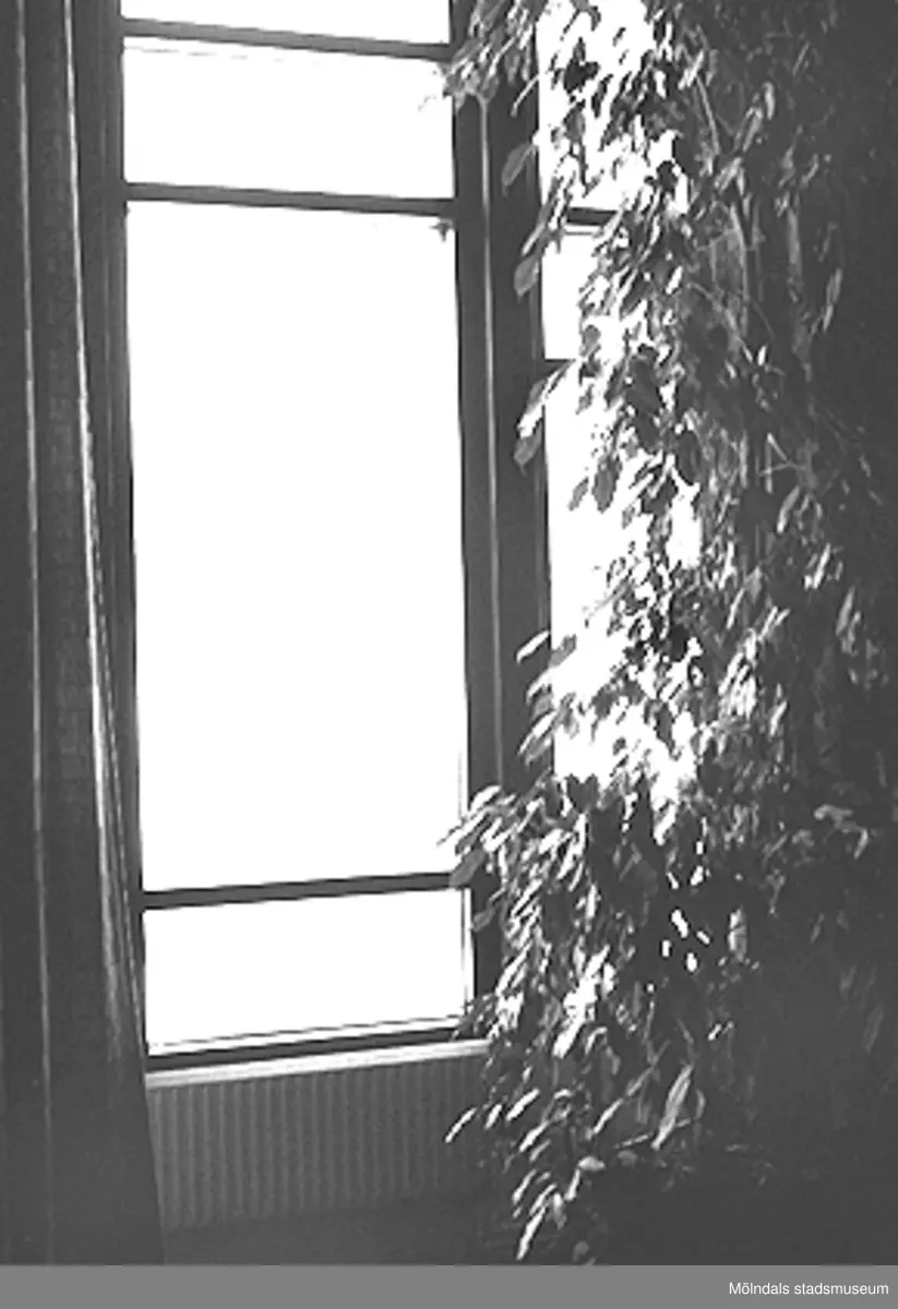 Mölndals stadshus, mars 1988. Byggnadsdetalj: Ett fönster med gardin och hög krukväxt, längst till höger i Stadsfullmäktiges sessionssal.