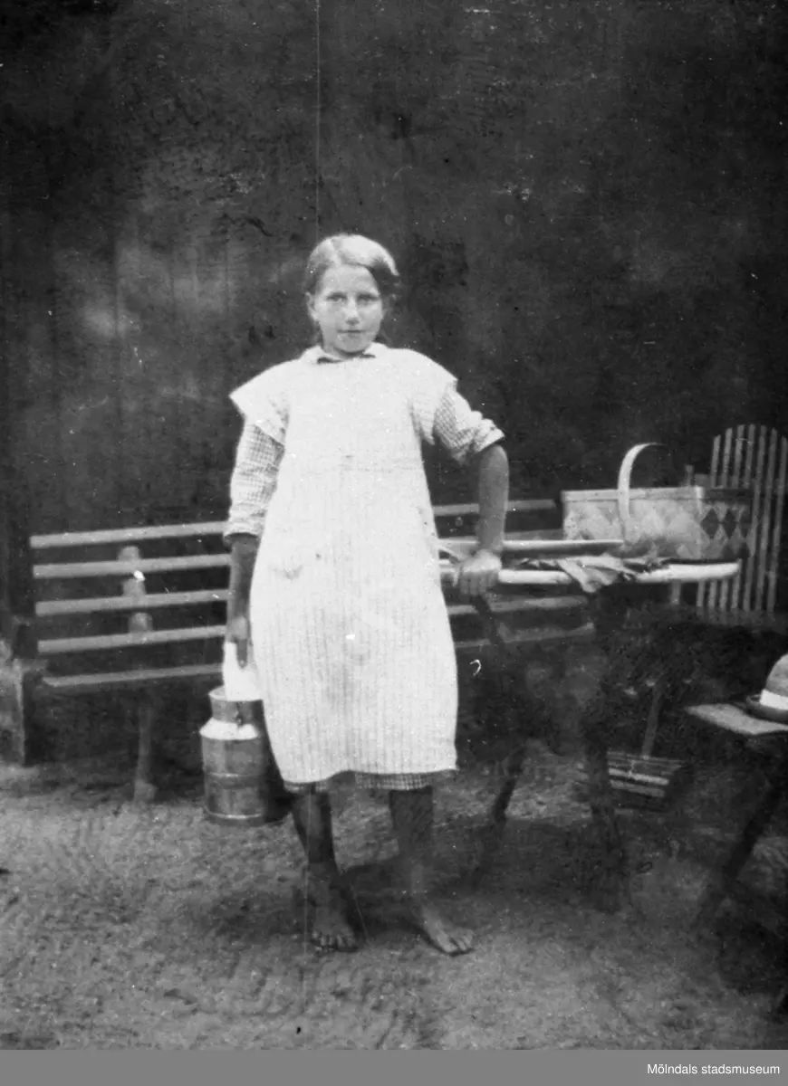 Helga Rohman (född Johansson) står barfota och håller en mjölkspann i högra handen, 1920-tal. Helga arbetade på Gunnebo slott.