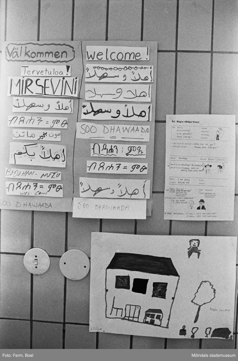 Några barnteckningar uppsatta på en kakelvägg. Dokumentation av Sagåsens flyktingförläggning, 1992.