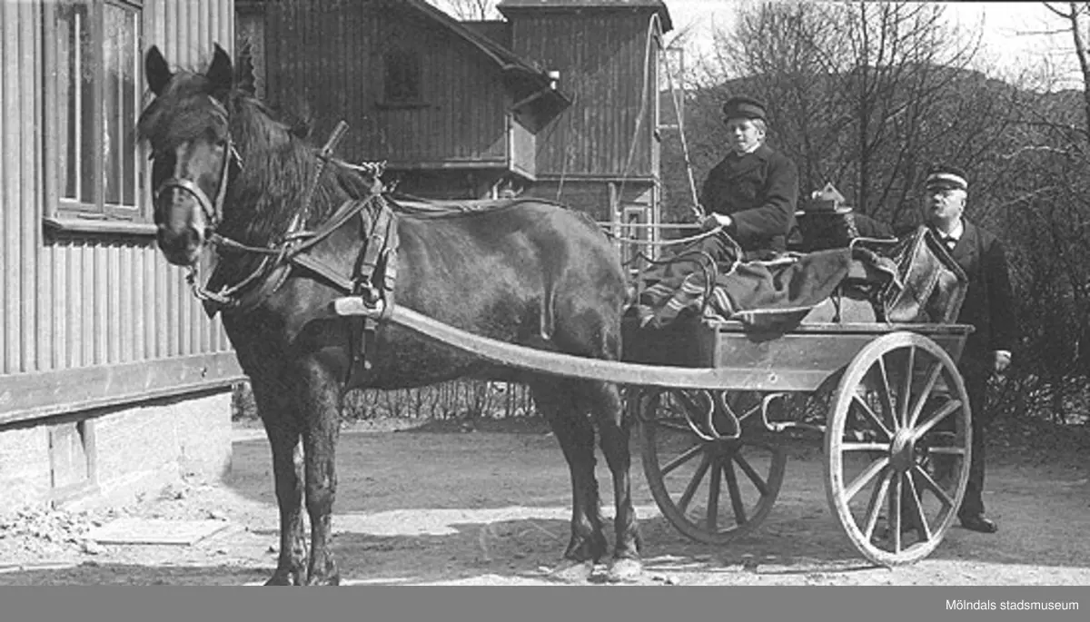 Vykort "brefkort " på häst med 2-hjulig kärra och kusk. Text på fotots framsida "Minne af den 22/1 1905. Wiktor" På baksidan