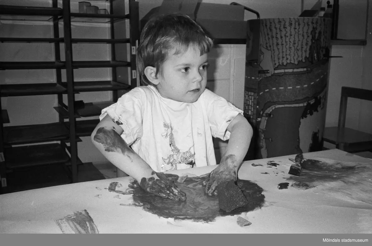 Lilla Alexandra målar med fingerfärg på Lunkentussen, Katrinebergs daghem, 1992.