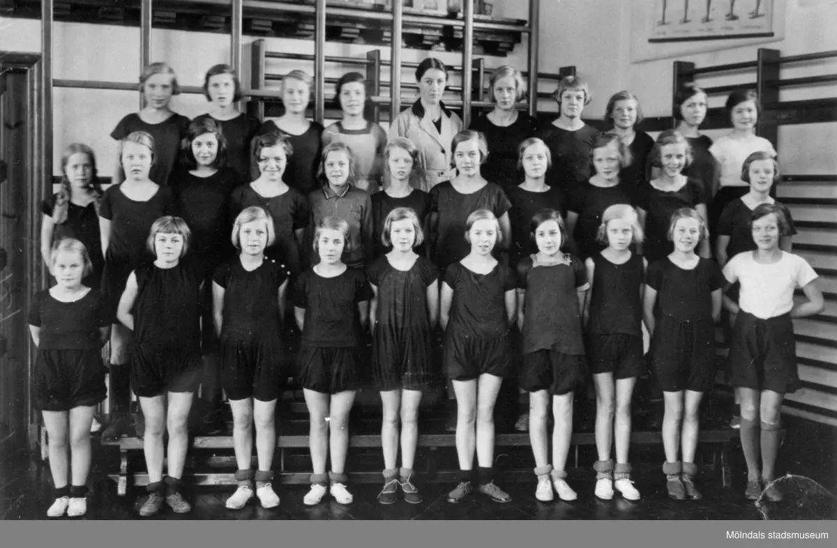 Gruppbild med flickor i gymnastikkläder uppställda i gymnastiksal på Kvarnbyskolan i Mölndal ca 1934.