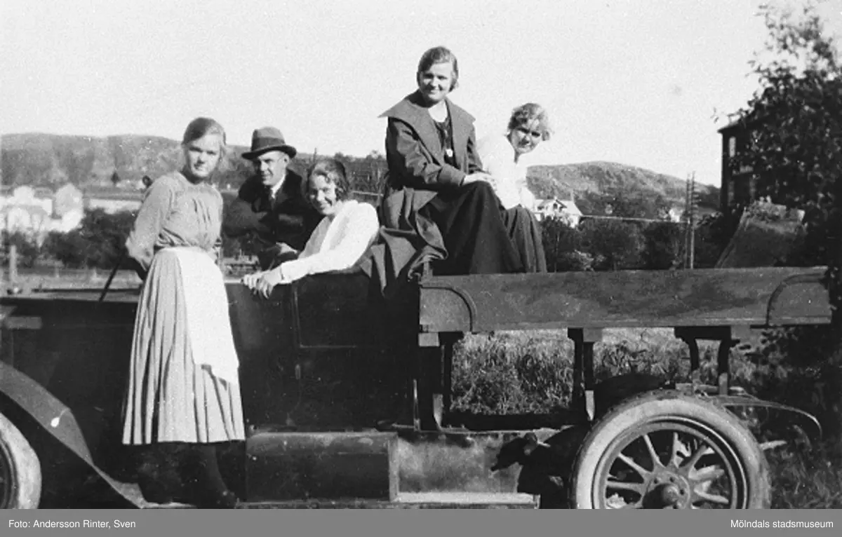 Syskonen Andersson i Torsten Anderssons bil cirka 1925. Från vänster: Elin, Torsten, Helga, Gertrud och Elsa.