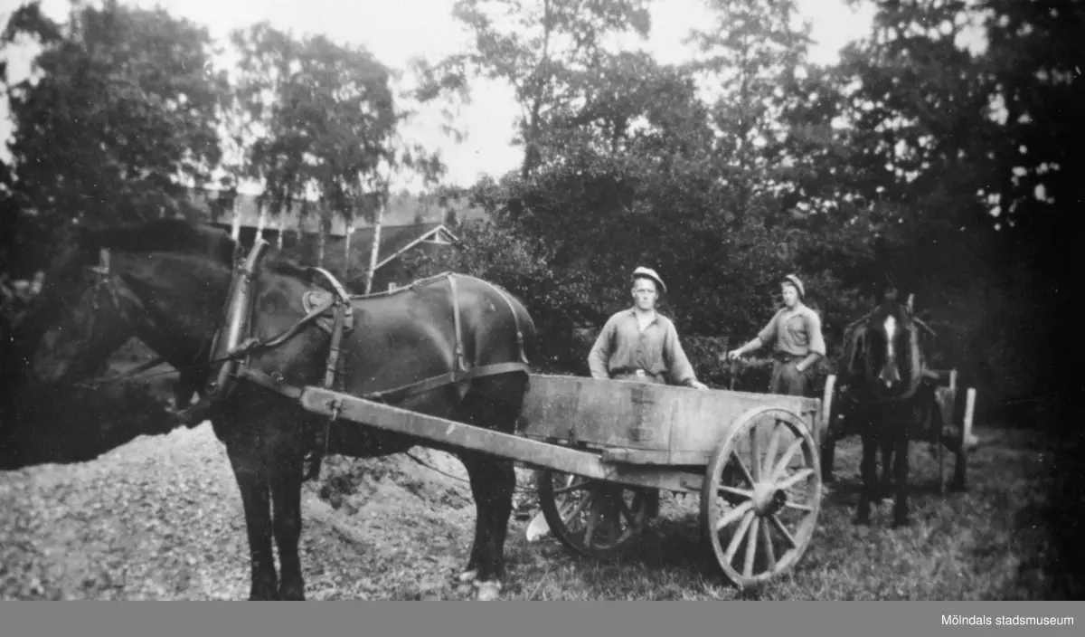 Arvid och Gustav bygger väg i Hällesåker, 1930. De har var sin häst med en kärra som kallades (Goppa), en kärra med flak som var ledad vid hjulaxeln. Fullt lass tippades med lätthet.