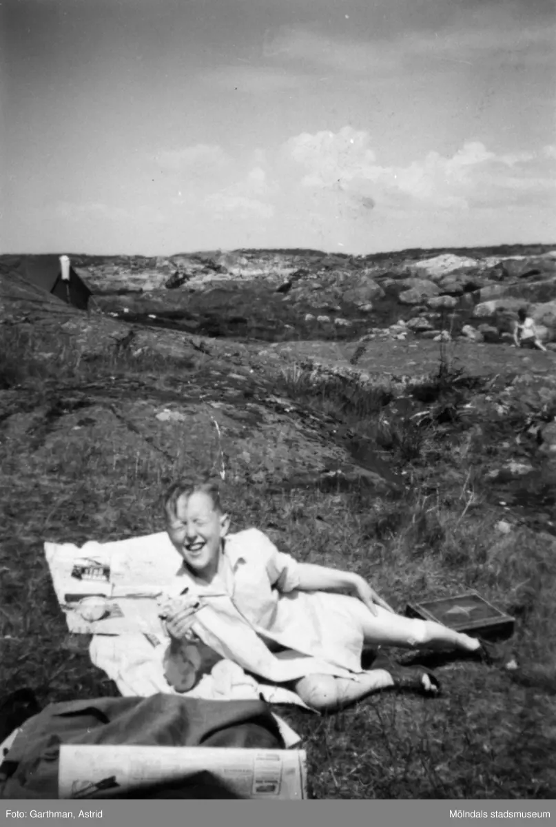 Leif Garthman fikar halvliggandes på en filt. Näset, 1950-tal.
