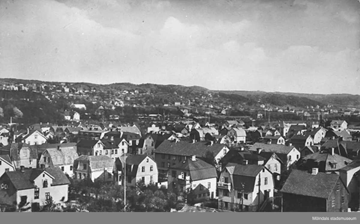 Vy över Mölndalsbroområdet från Kyrkberget i nordväst, ca 1934. I förgrunden ses Bergmansgatan och i bakgrunden ses husen vid Medborgargatan och Frölundagatan.