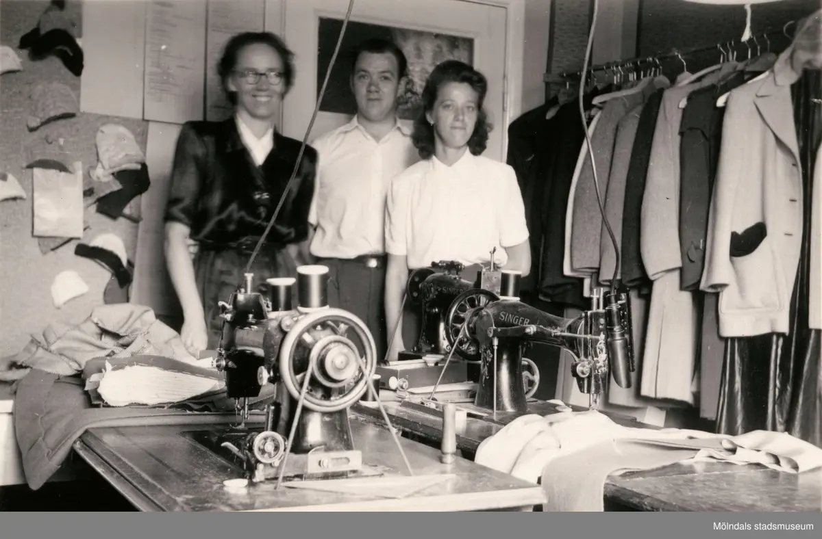 Paul Kristofferssons Skrädderi på Frölundagatan 20 i Mölndal, omkring 1945. Skrädderiet startades år 1936. Från vänster ses Stina Pettersson (dotter till Edvin Pettersson, Mölndals Glasmästeri), Paul Kristoffersson och Rut Jansson.