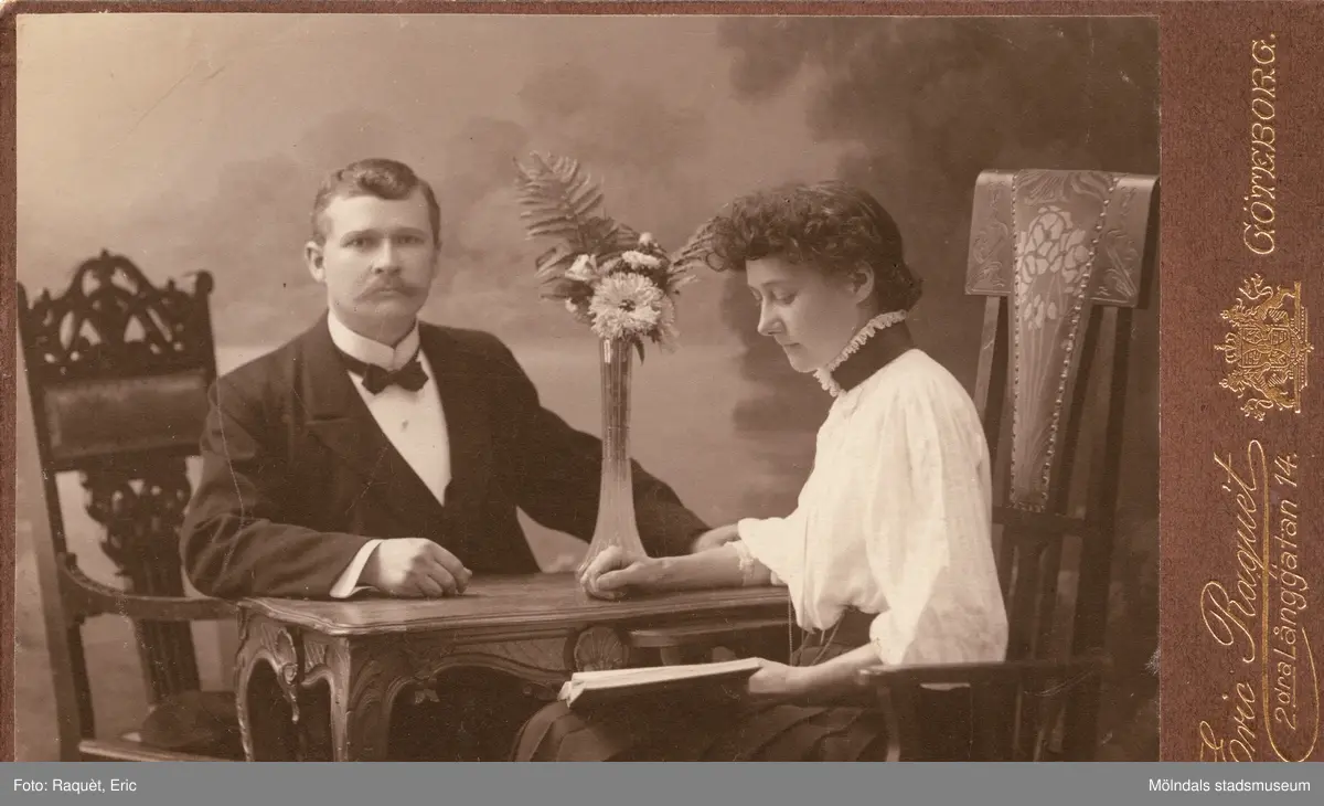 Porträttfotografi av Oskar Wilhelm Börjesson (11/9 1874 - 7/3 1919) med maka Hilda "Lisa" Börjesson, född Ny (1883 - 1966). Paret sitter vid ett bord. Mannen tittar in i kameran medan kvinnan tittar ned i en bok.