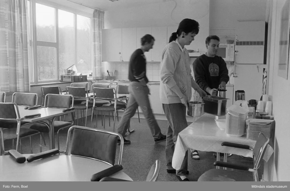 Dokumentation av Sagåsens flyktingförläggning 1992. En kvinna och två män i ett kök, där de tar mat från kantiner.