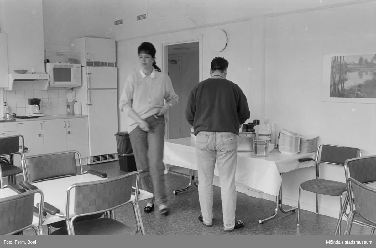 Dokumentation av Sagåsens flyktingförläggning 1992. Två personer som står ett kök möblerat med bord och stolar.