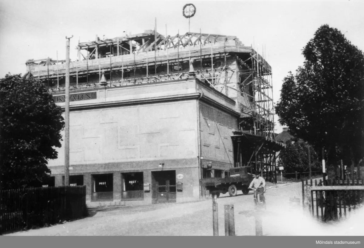 Taklagskalas för höghusdelen av "Mölndals skyskrapa", Kvarnbygatan 1, som byggdes under 1930-talet. Biografen Röda Kvarn (kallades "Isbingen"), fotad från sydväst. Hitre delen av huset var färdig 1928, men höghusdelen byggdes betydligt senare.