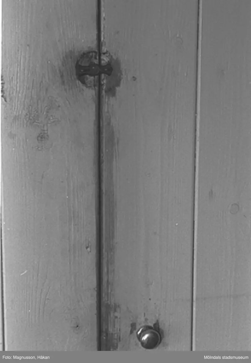 Dörren till ett kallskafferi intill trappan till andra våningen i bostadshus på Våmmedal 2:9, 3:2 och 3:3 i Kållered, september 1991.