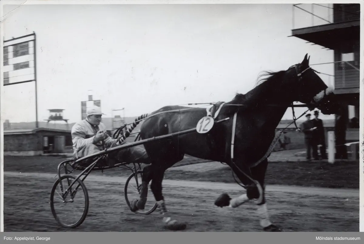 Åbykusken Ragnar Thorngren, i sulky bakom travhästen Voltite (Volomite - Ruth's Baby), Åby travbana. Bild troligen tagen mellan 1947-1952.