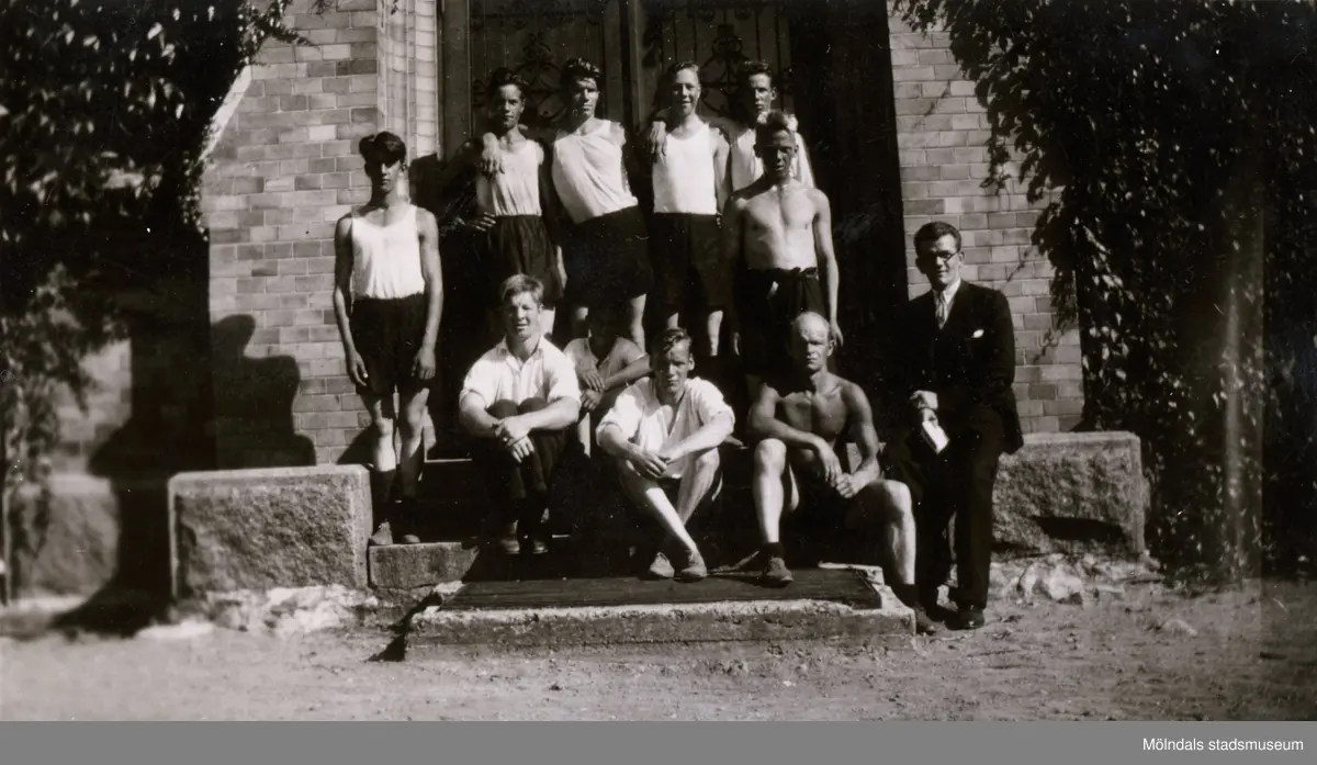Gruppfotografi av en samling idrottsmän. Stretered i Kållered. "Ur Ivar Anderssons fotoalbum."