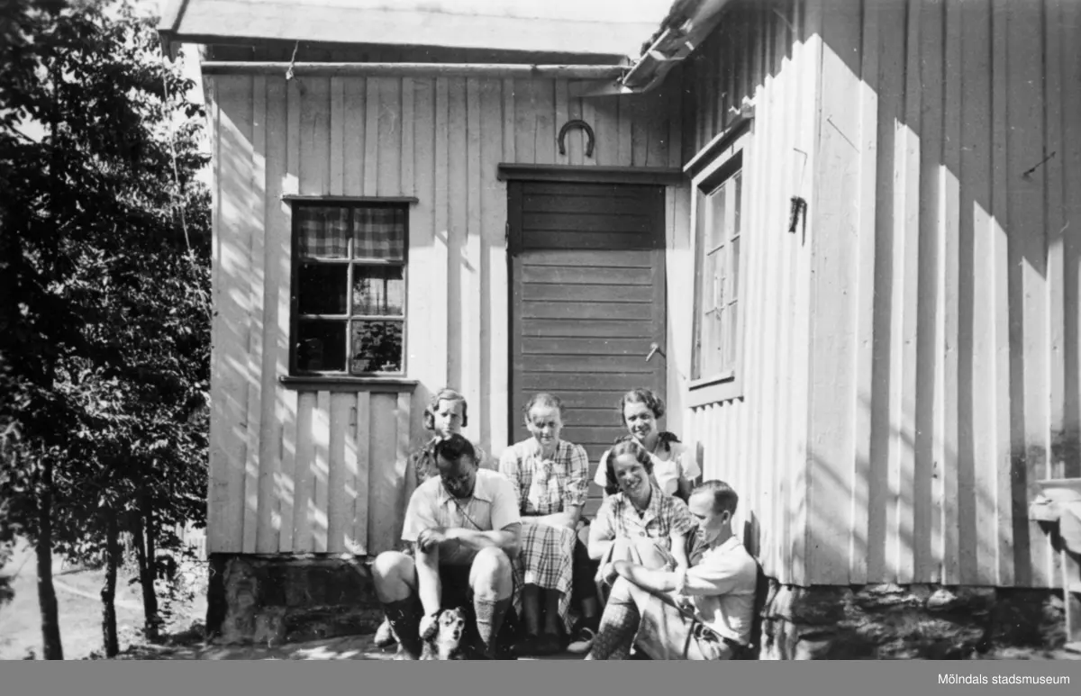 Liten släktträff utanför huset, 1932. Med på bild: Sonja, Augusta, Singhild och Arnold.