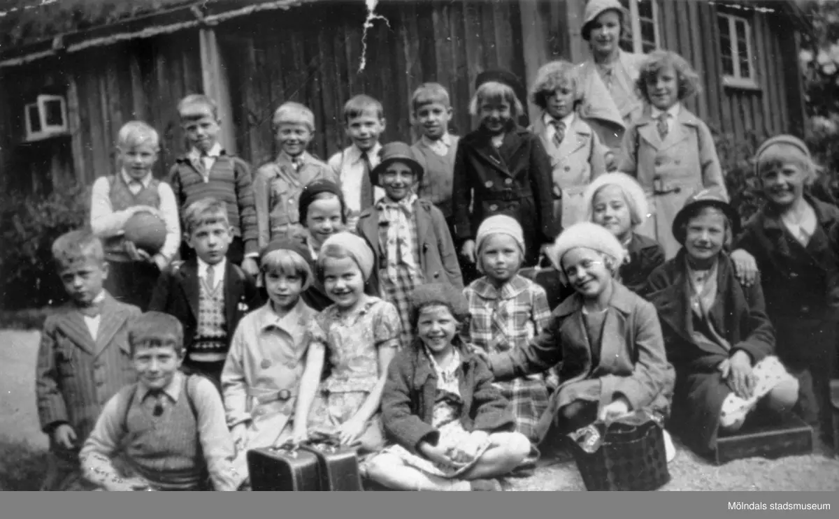 Flickor och pojkar uppställda utomhus. Ormåsskolan 1930-tal.