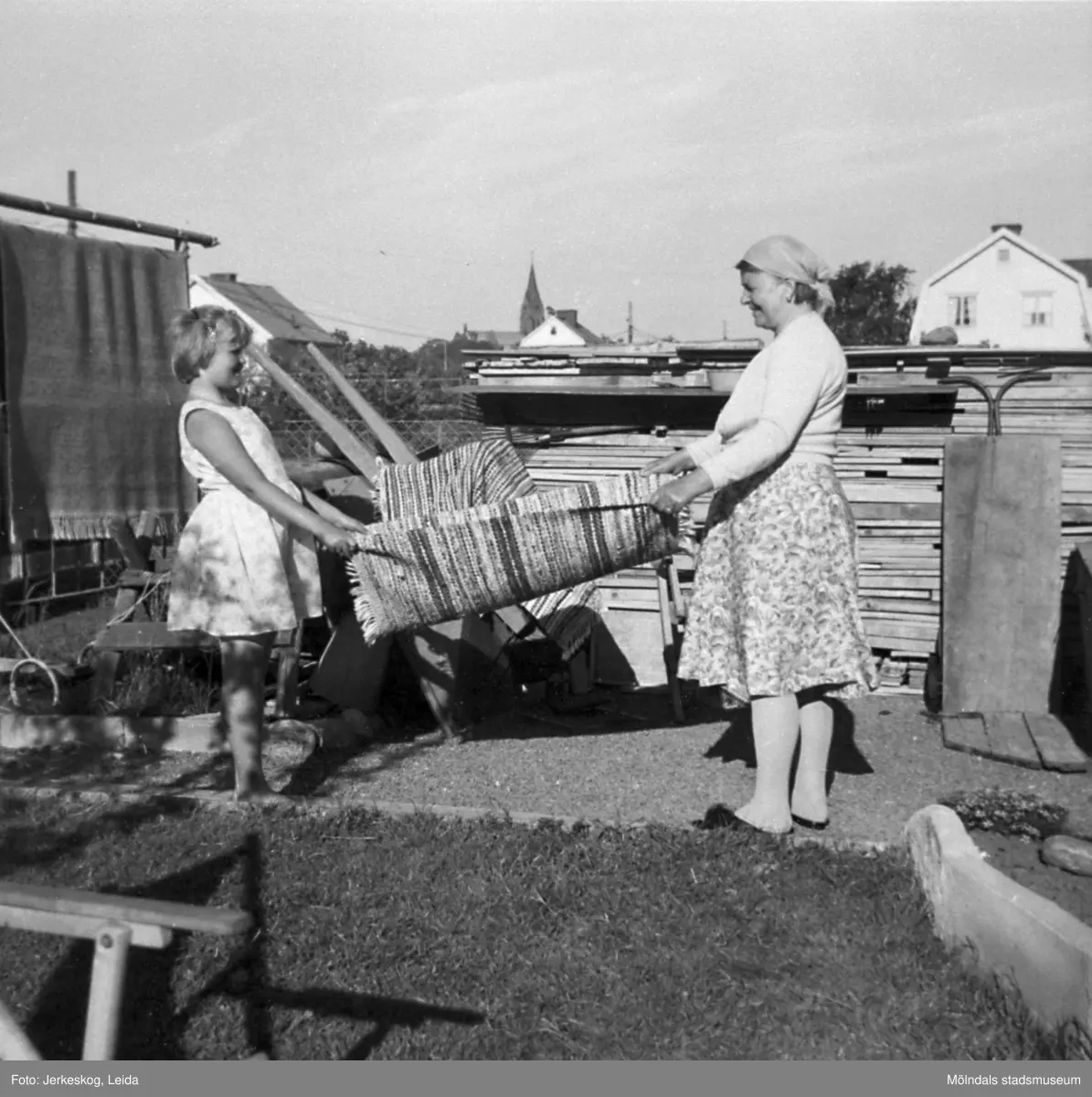 Marita Jerkeskog och Fedosja Teuhtonen skakar en matta, Idunagatan 39, 1960.