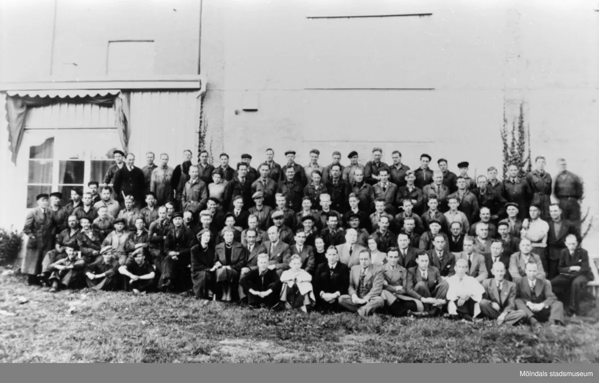 Personalen på A.B. Pumpindustri uppställda för foto utanför fabriken, 1960-talet.