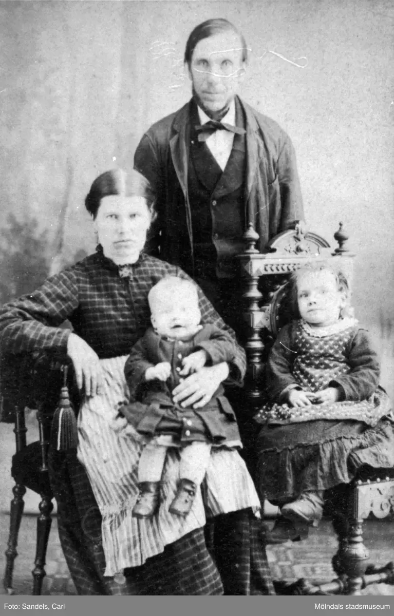 Porträttfoto av en stående man, en sittande kvinna (Edith Johansson) med ett litet barn i knäet samt en flicka som sitter på en egen stol. Edith arbetade i trädgården på Gunnebo slott 1914-1917.