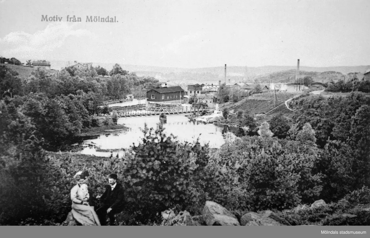 Vykort "Motiv från Mölndal" postat 28/2 1911. Utsikt från Stensjöbacke ned mot Grevedämmet, Grevedämmets järnvägsbro och Rackarebron med början av Pixbovägen.