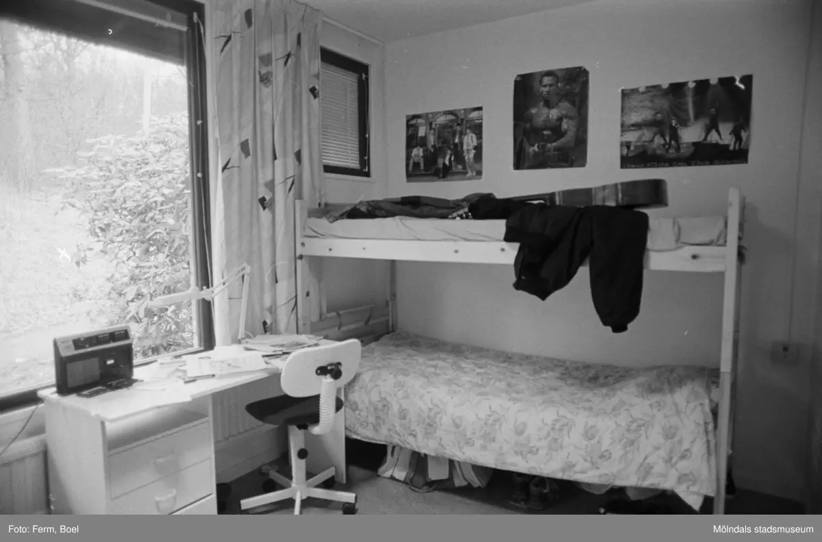Ett rum med skrivbord och våningssäng. Dokumentation av Sagåsens flyktingförläggning, 1992.