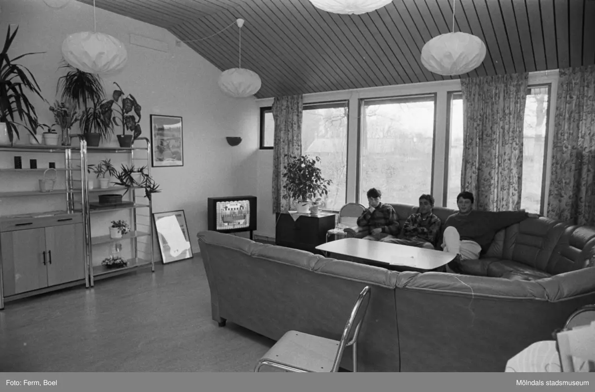 Ett allrum där tre män sitter i en soffa. Dokumentation av Sagåsens flyktingförläggning, 1992.