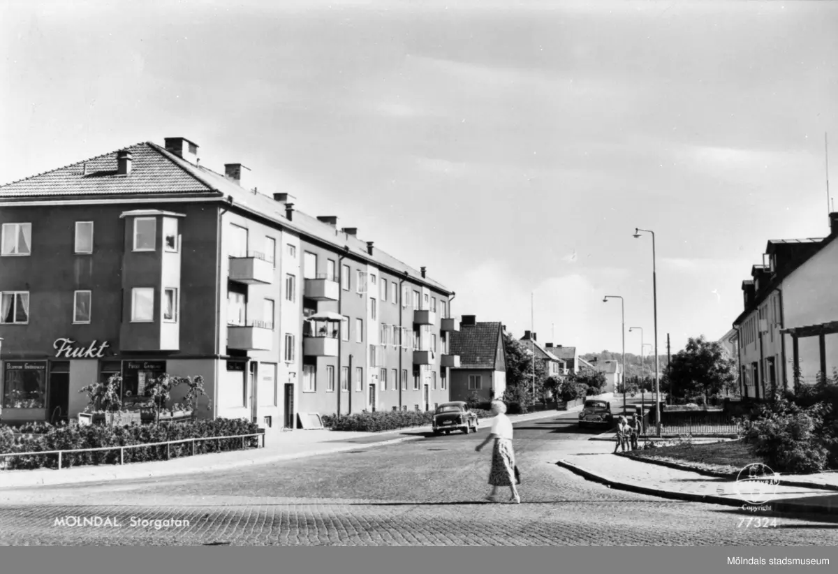 Vykort "Mölndal. Storgatan" från 1950-tal. Utsikt från Frölundagatan utefter Storgatan söderut. Till vänster (husets gavel) ligger Brogatan 23 (Berghedes Frukt & Blommor, Danskens bageri på hörnet, senare Järnhuset). Lägenheterna ligger på Storgatan 33A-C. Till höger skymtar Storgatan 34-36.