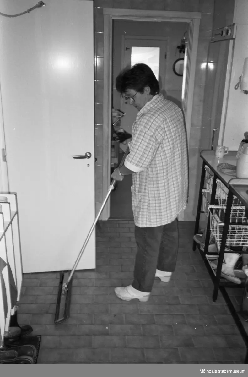 En kvinnlig anställd, iklädd städrock, svabbar av klinkergolvet i hallen på Katrinebergs daghem.