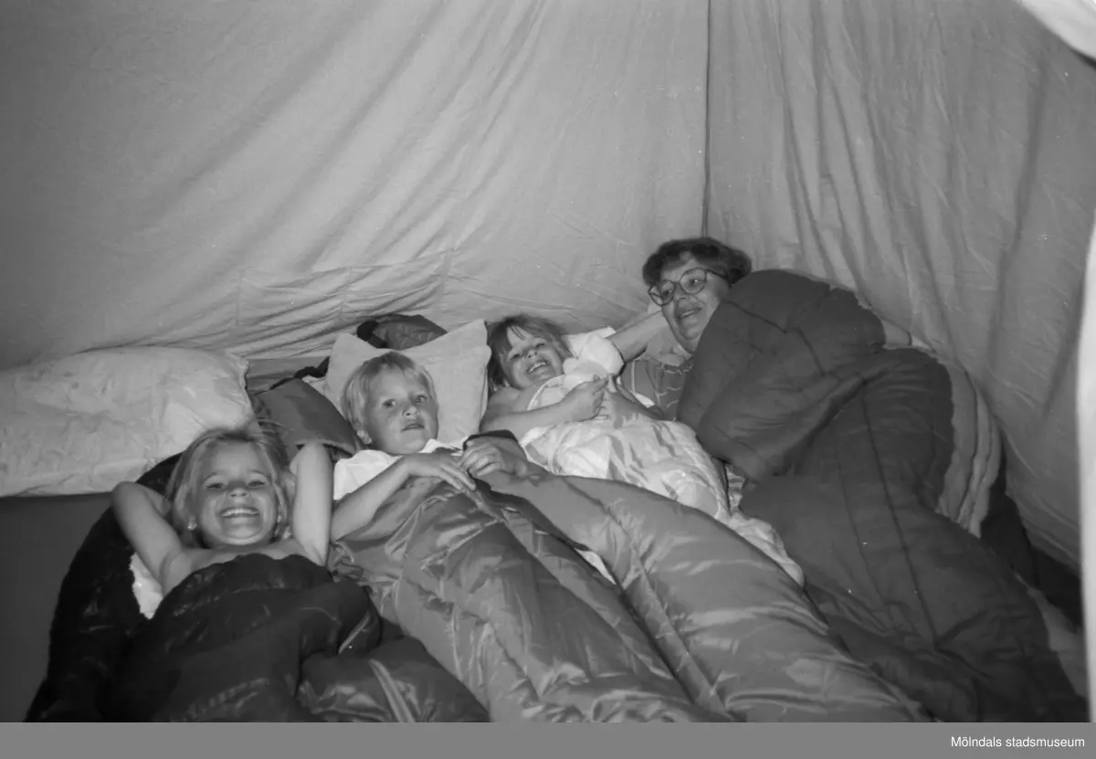 Birgitta Fält med barnen Jessika, Sofia och Andreas ligger i sovsäckar inne i ett tält. De kommer från Lunkentussen, Katrinebergs daghem, 1992-93.