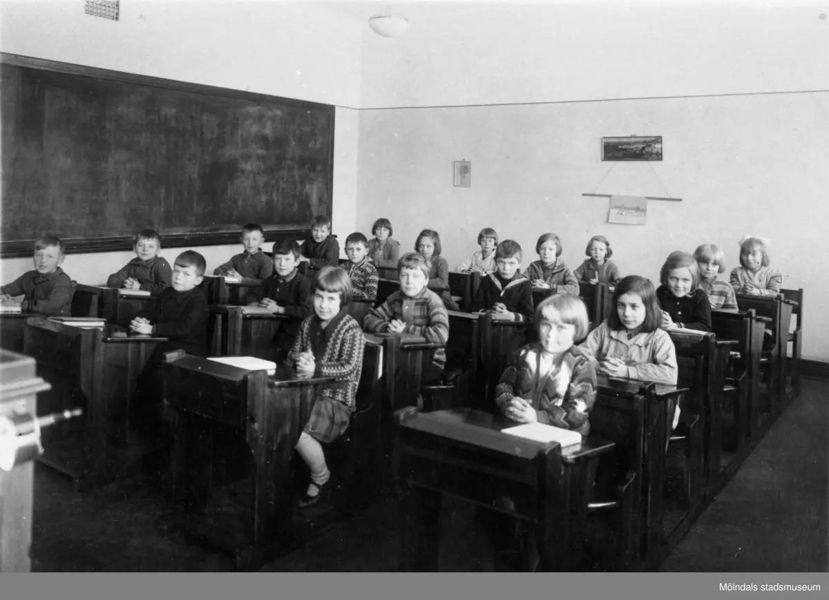 Elever sittande i sina bänkar med knäppta händer på Kvarnbyskolan i Mölndal ca 1930.