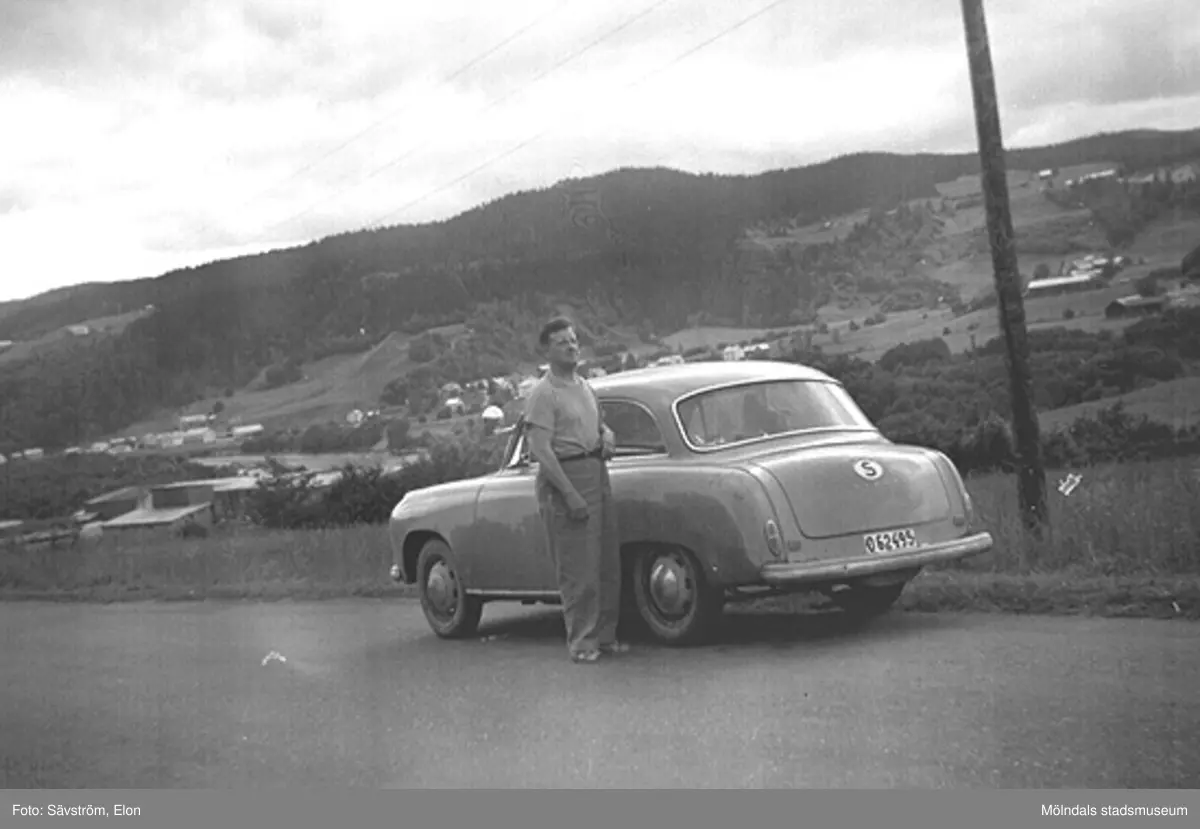 Helmer Garthman är på väg till Norge för fiskesemester med Elon Sävström och dennes bil, en Goliat Isabella. Här är det paus i Värmland. 1960-tal. Skänkt av sonen Alf Garthman som arbetade många år på Mölndals stadsmuseum.
