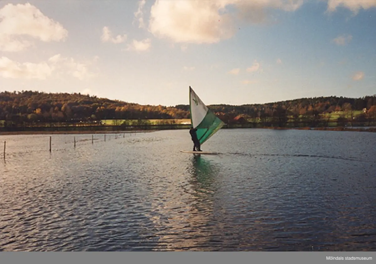 En person som vindsurfar över Berget 1:135, Lindome i oktober 1998. Lindomeån har svämmat över fälten mellan gården och gamla riksvägen (ganska vanligt). Och anledningen till att vindsurfaren är fotad är att det var märkligt att se en vindsurfare här. Relaterat motiv: 2004_0902.