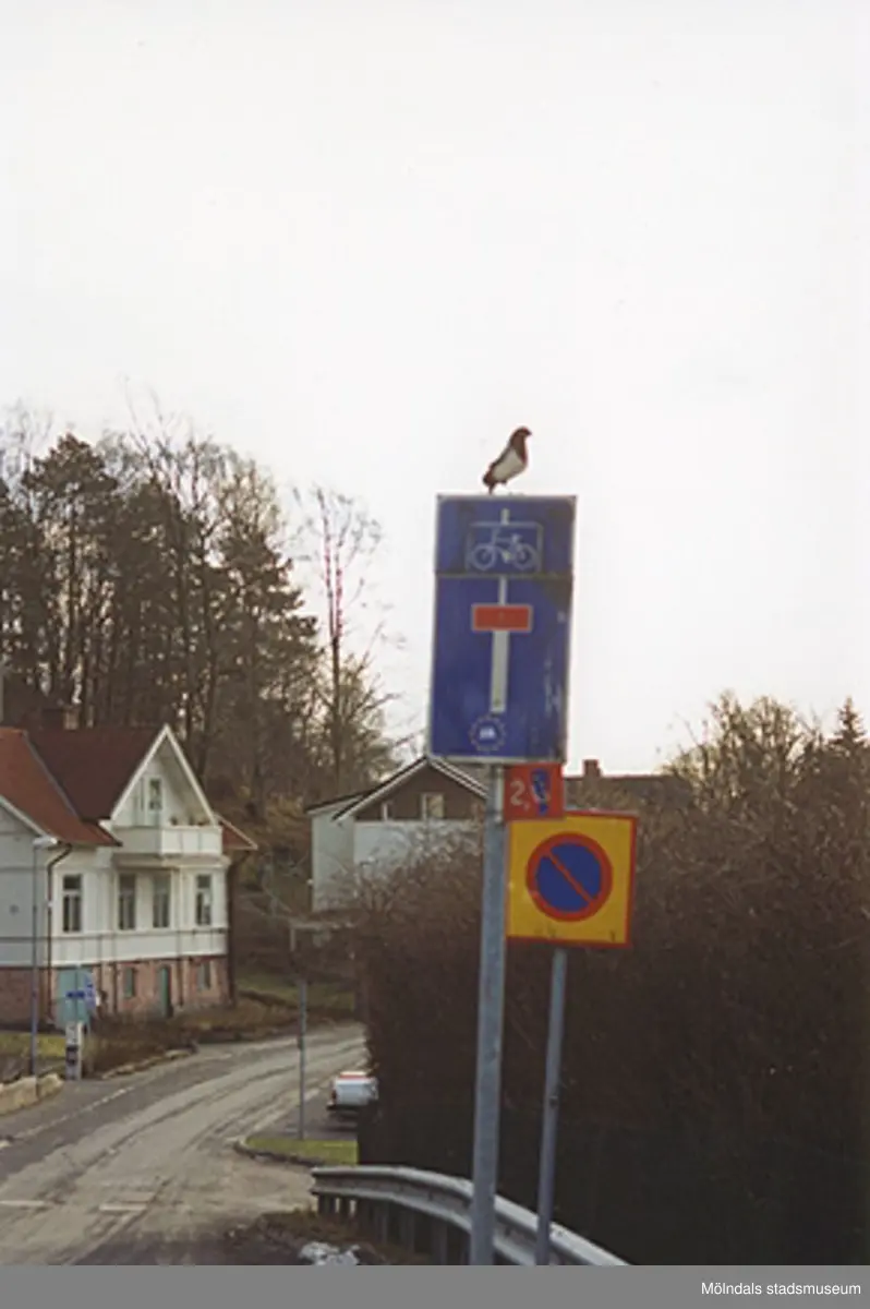 Skyltar mittemot gamla sjukstugan, f.d polishuset och där Mölndals museum tidigare låg (1986-2002), Norra Forsåkersgatan 19 år 2001. På en av skyltarna sitter en fågel. Den vita byggnaden till vänster ligger på Norra Forsåkersgatan 21.
