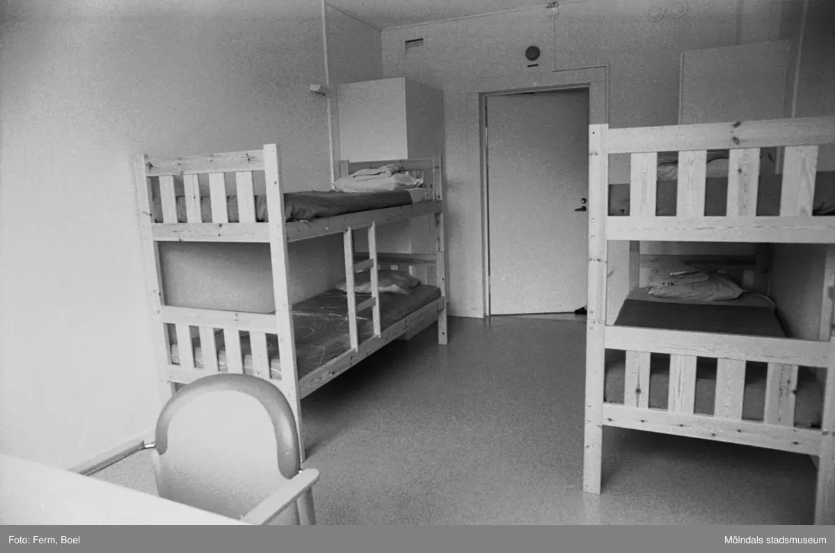 Dokumentation av Sagåsens flyktingförläggning 1992. Ett rum inrett med två våningssängar, skrivbord och stol.