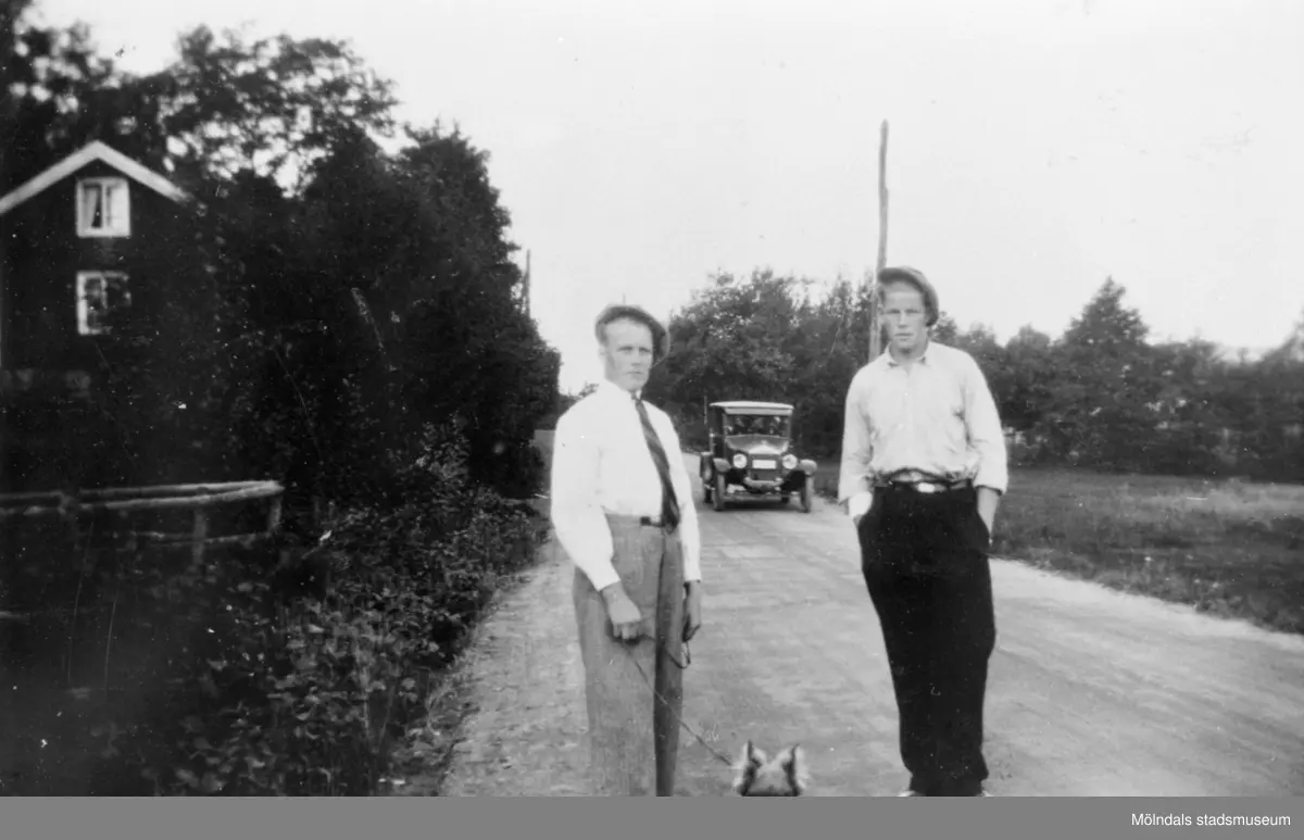 Arvid och Gustav med hund utanför sitt hem Antons, 1930-talet. En tidstypisk bil kommer bakom.