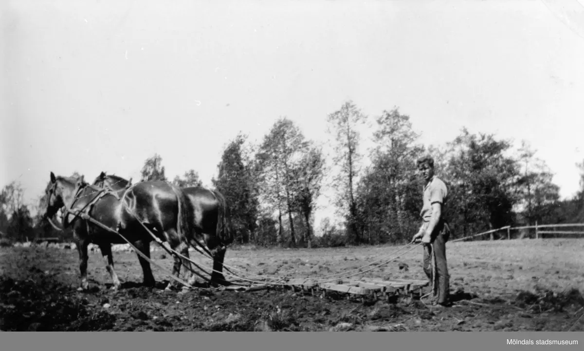 Sven Olsson i Bäck, harvar med parhästar, 1930.