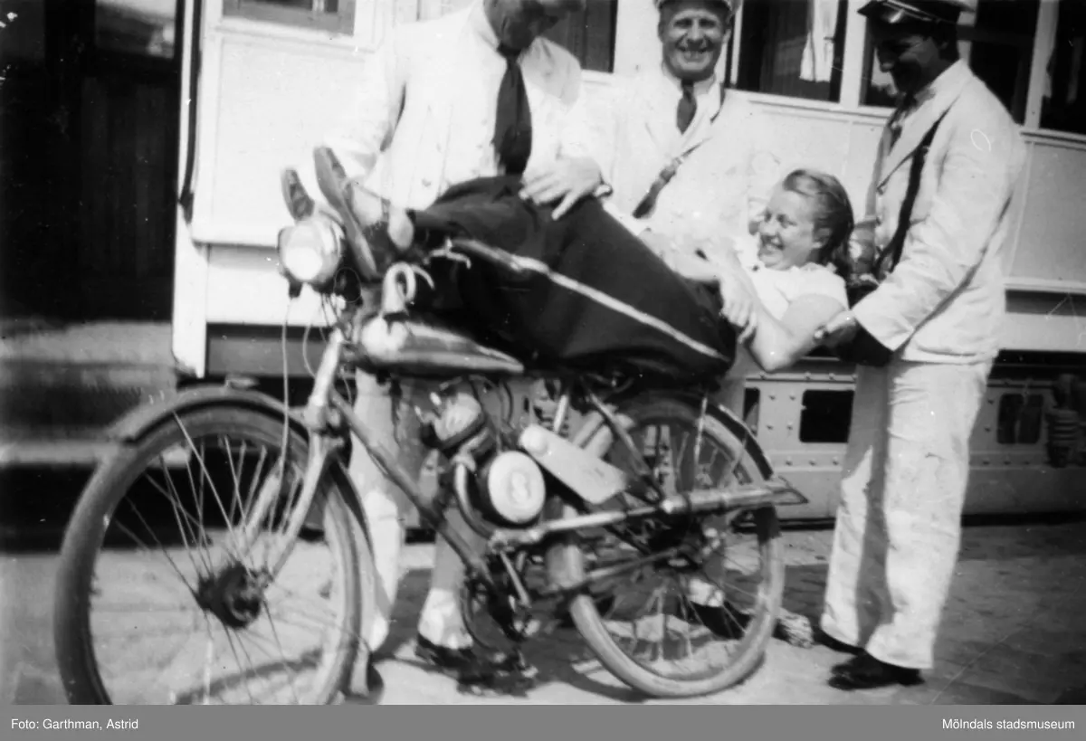 Fyra män och en lättviktare, 98cc (cykel med motor), 1930-tal. Personerna är okända för givaren.