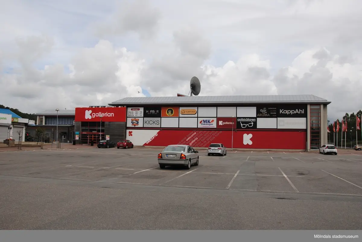Byggnadsdokumentation av affärscentrum K-gallerian i Kållered med adress Ekenleden 6, Våmmedal 2:158, som fått rivningslov. Exterörfotografi från söder den 5/7 2016.