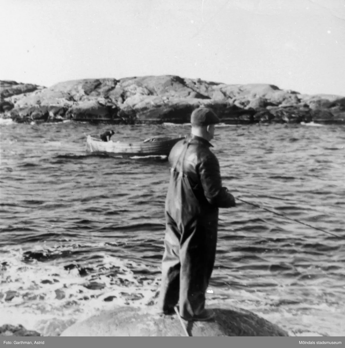 Helmer Garthman står på en klippa och fiskar. Näset, 1960-tal.